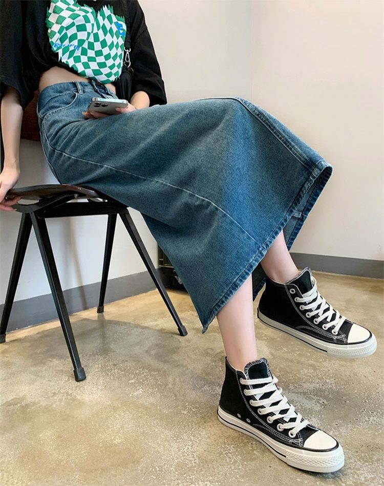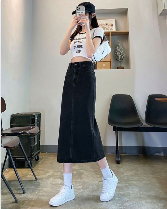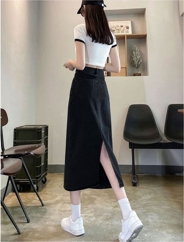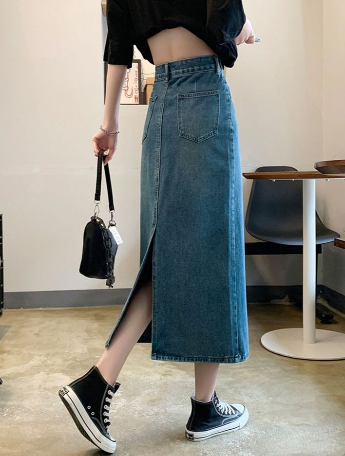 カジュアルながらも上品な印象を与えるデニム素材のタイトスカートです。