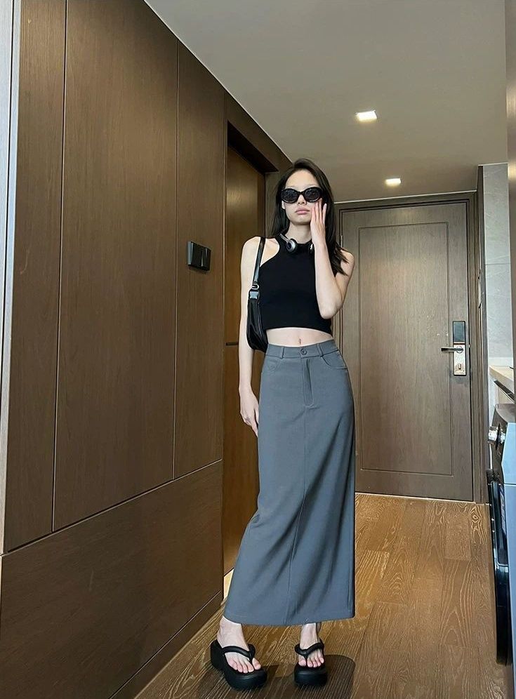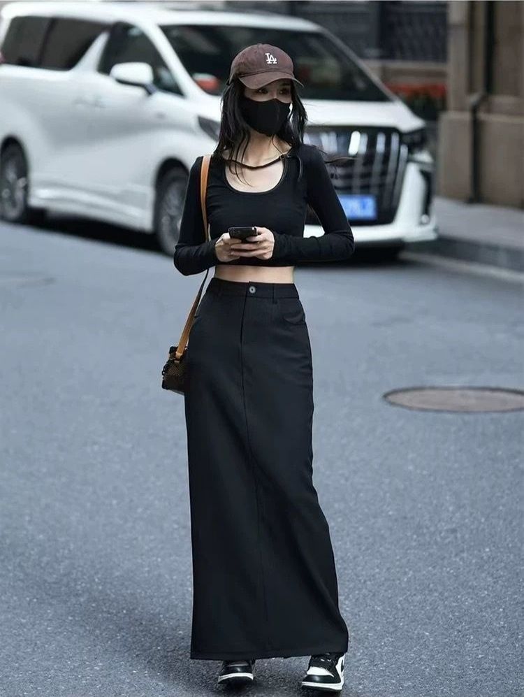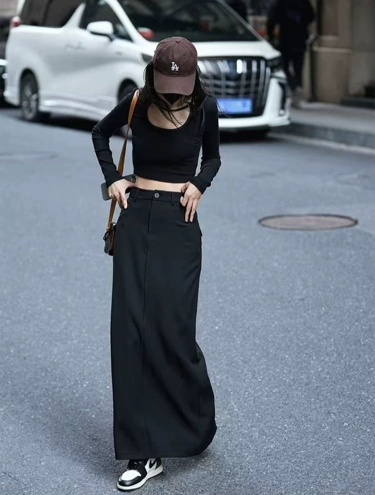 体のラインを美しく見せるフィット感と、足首まで続くマキシ丈が上品な印象を演出します。