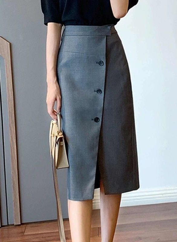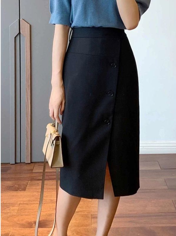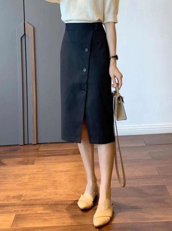 上品な印象を与えるサイドボタンが特徴的なタイトスカートです。