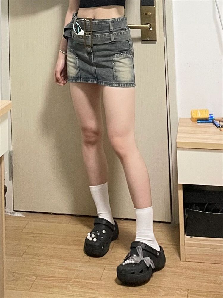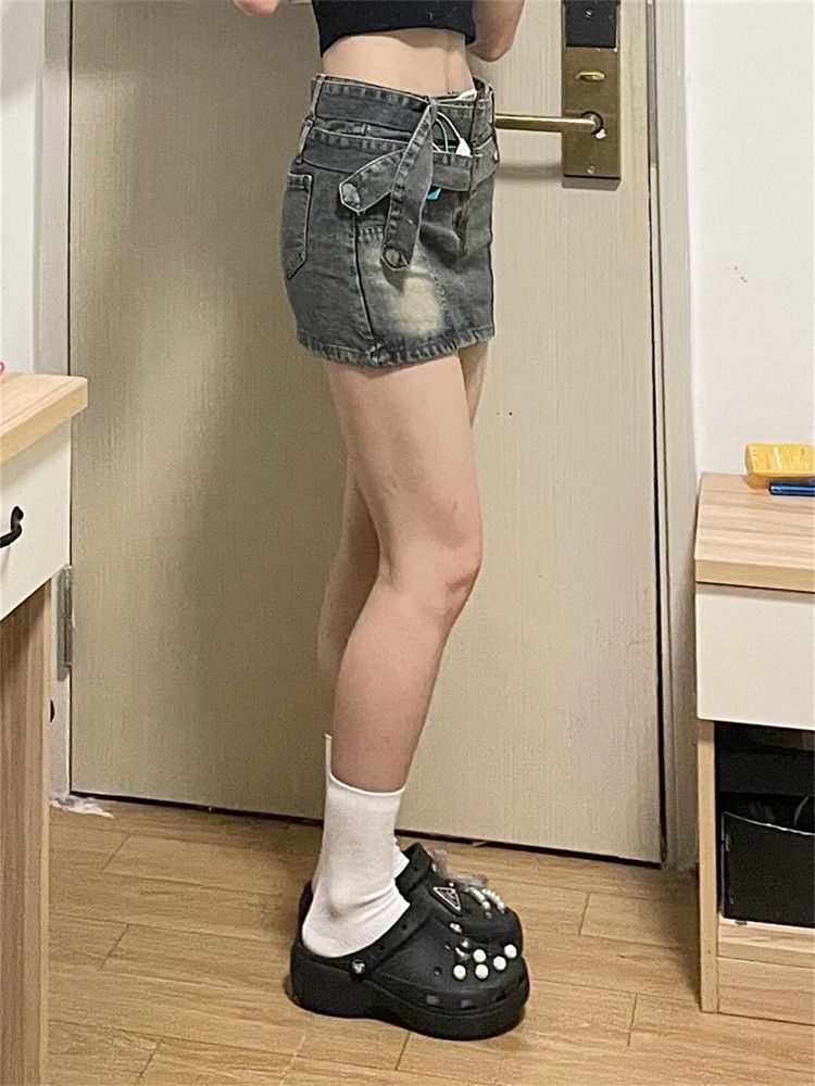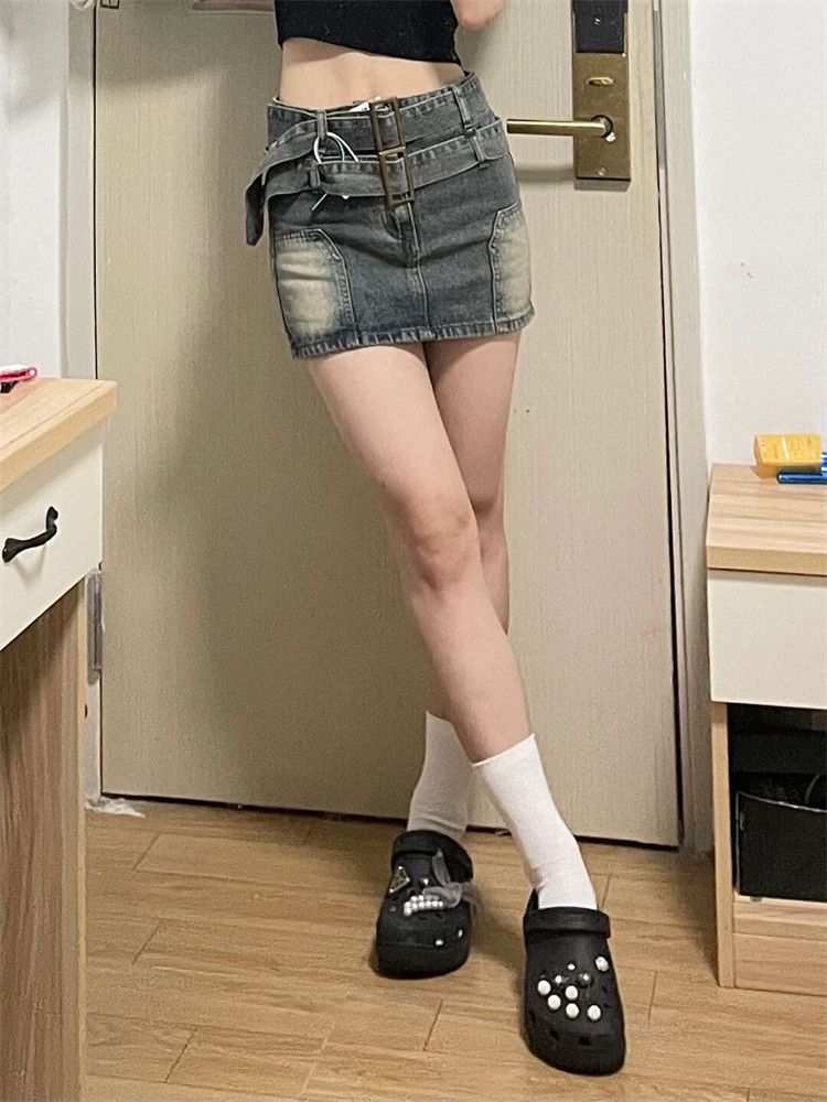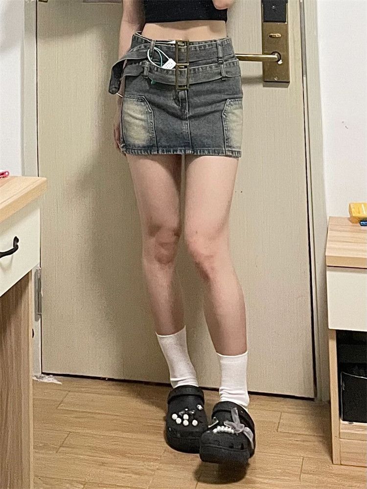 個性的な二重ベルトデザインが目を引くデニム素材のタイトスカートです。