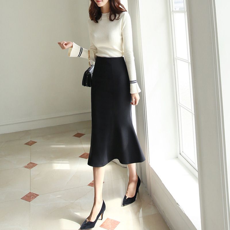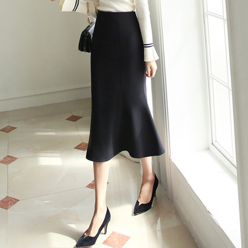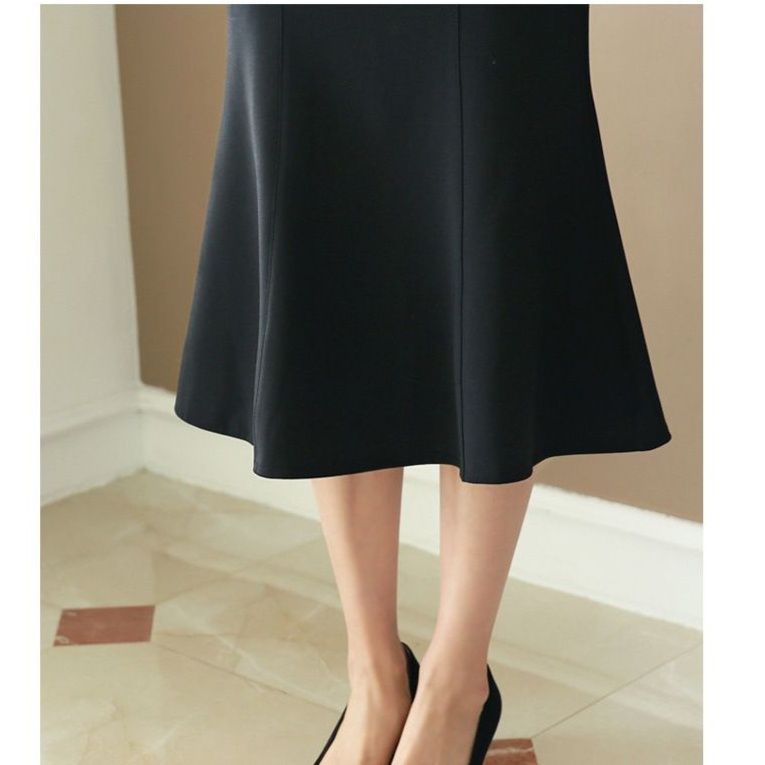 膝下まで続くロング丈が上品な印象を与え、裾に向かって広がるマーメイドシルエットが歩くたびに優雅な動きを生み出します。