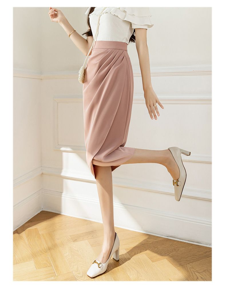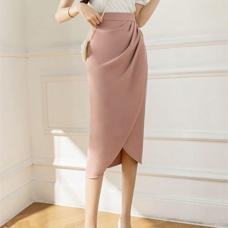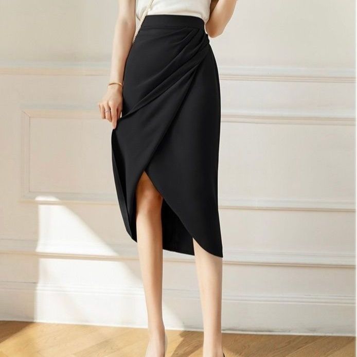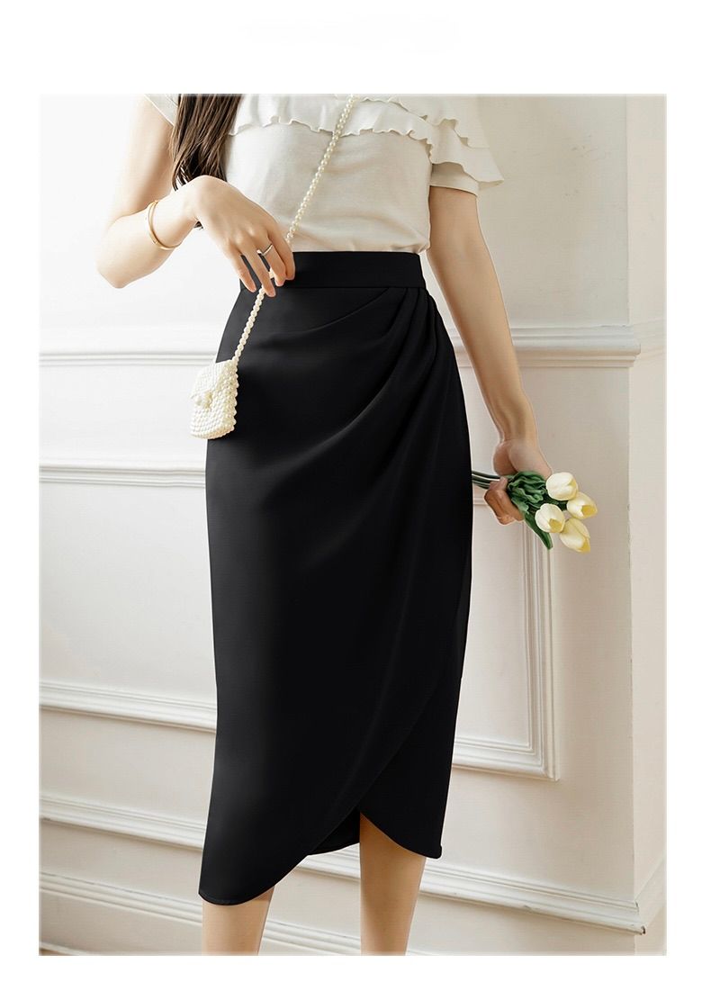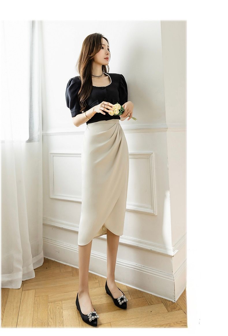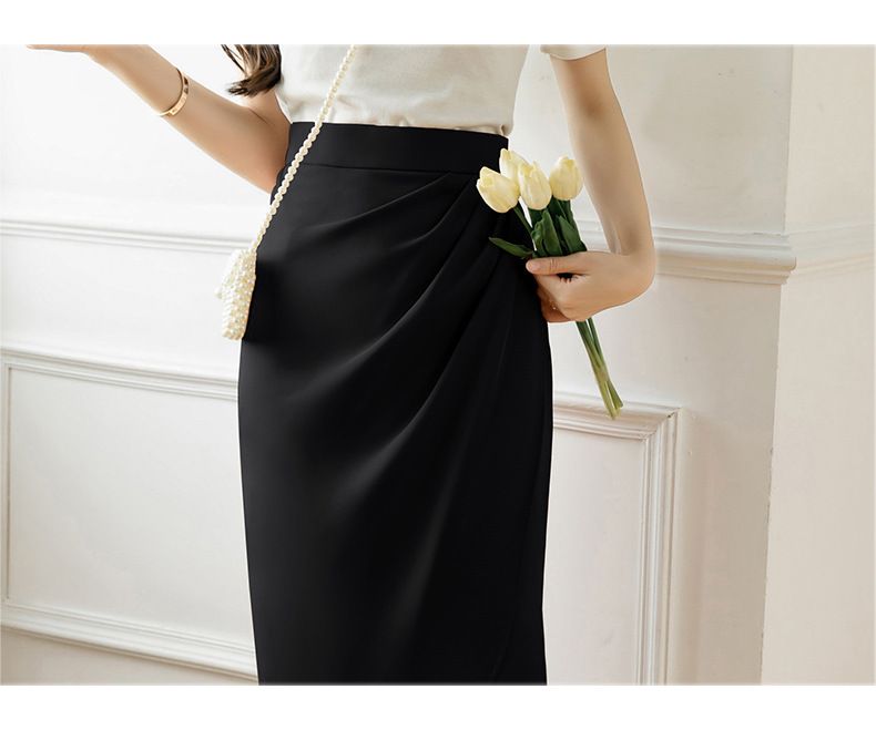 ウエスト部分の巻きデザインが腰回りをすっきりと見せ、裾の重なりが動くたびに優雅な印象を与えます。