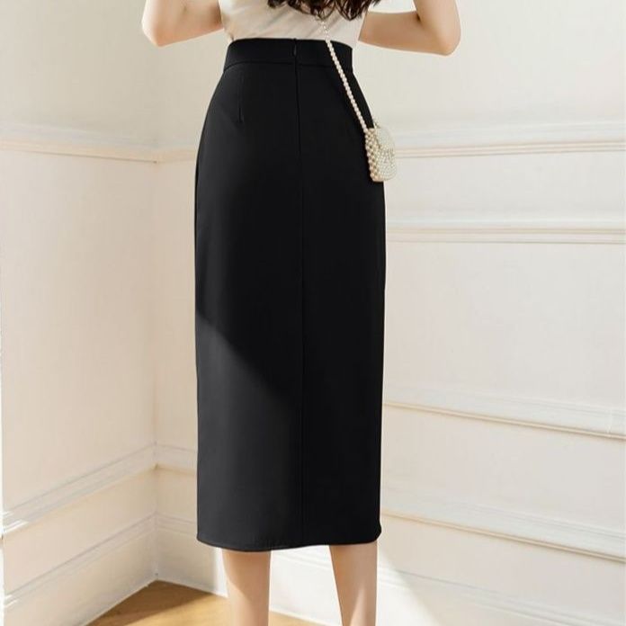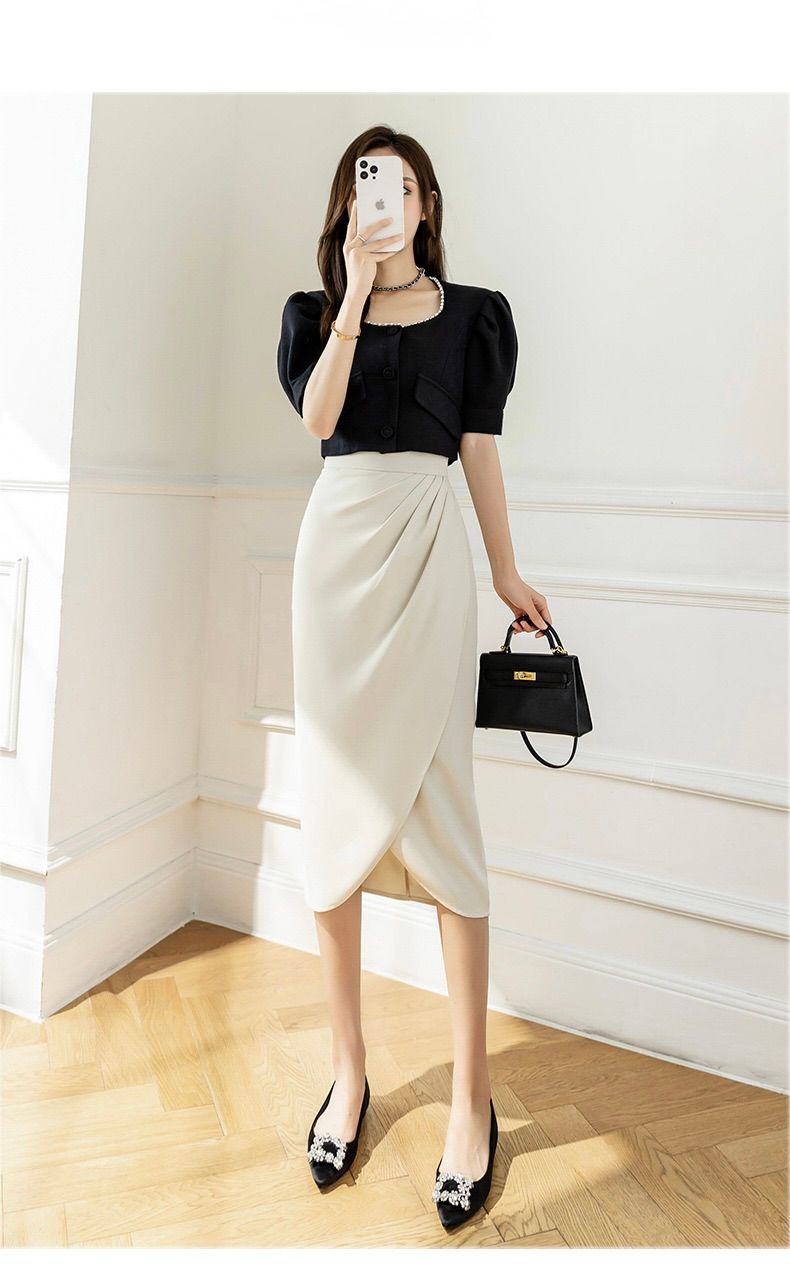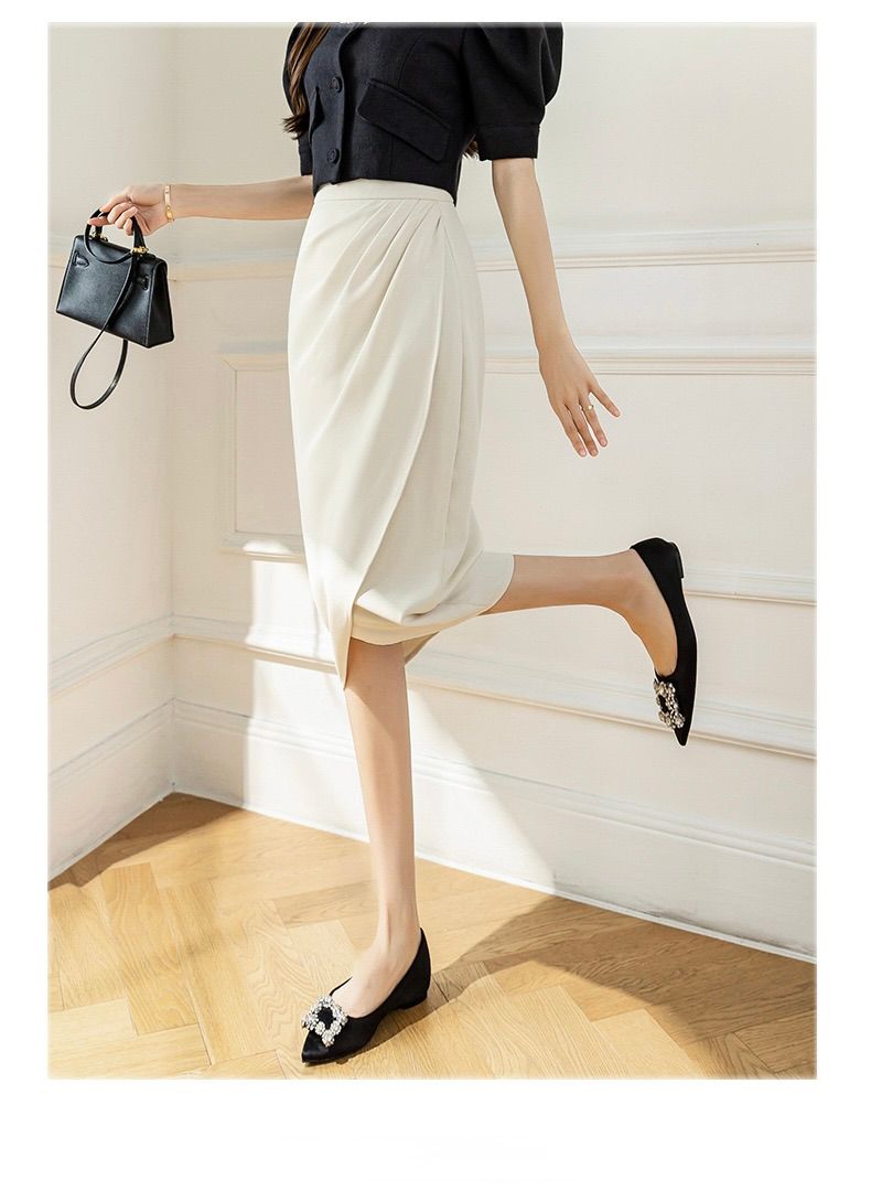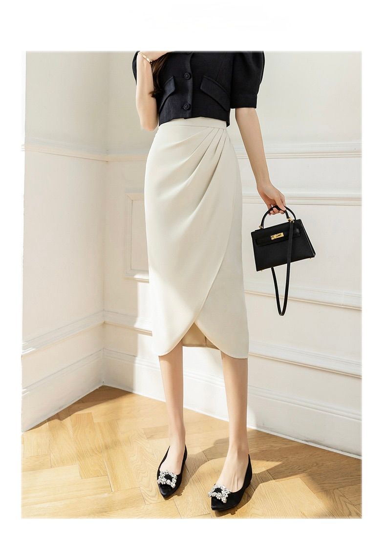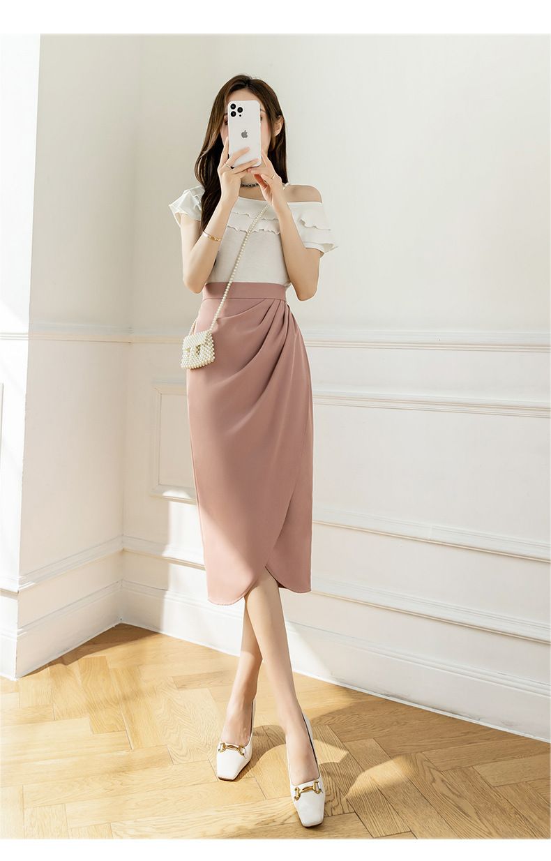 ウエスト部分の巻きデザインが腰回りをすっきりと見せ、裾の重なりが動くたびに優雅な印象を与えます。
