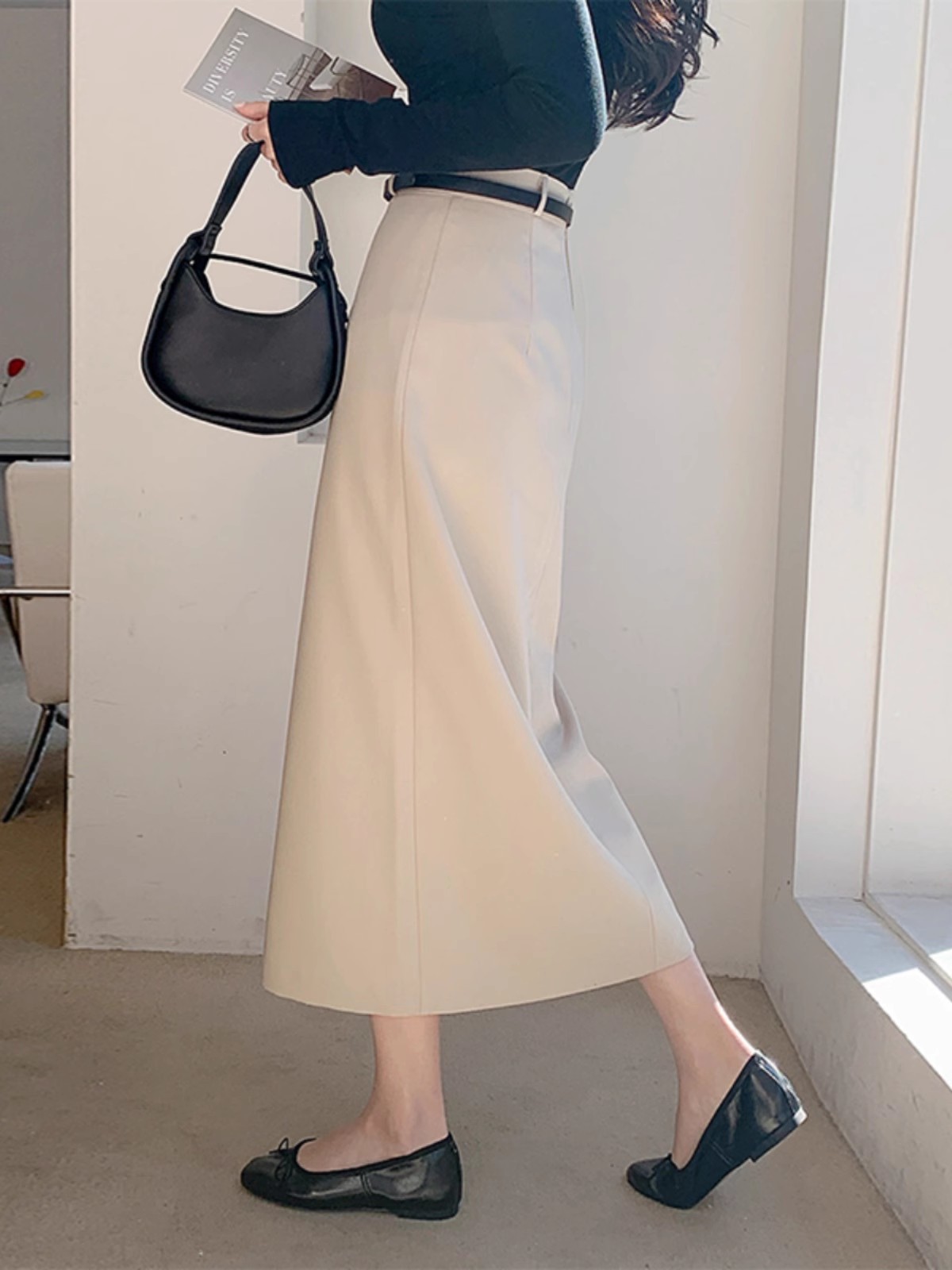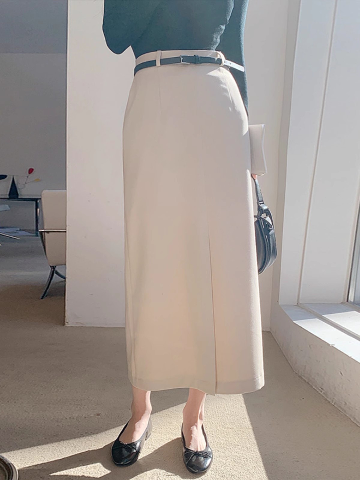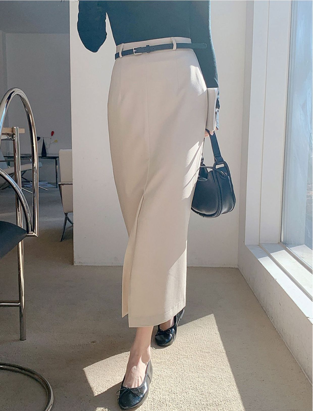ロング丈なので上品で落ち着いた印象を与え、オフィスシーンからフォーマルな場面まで幅広く活躍します。