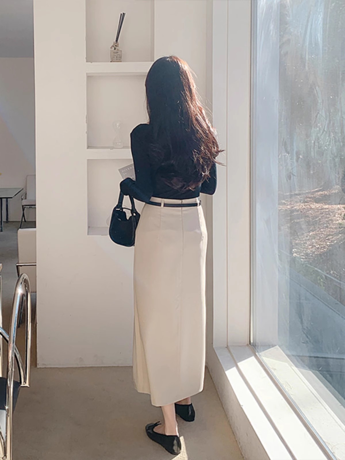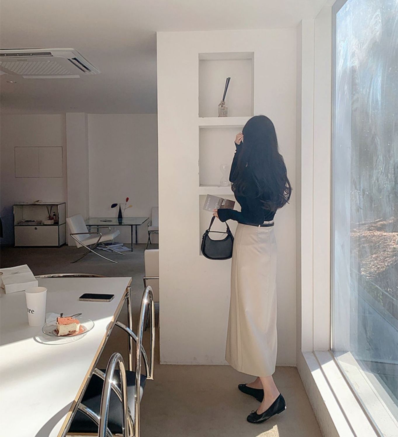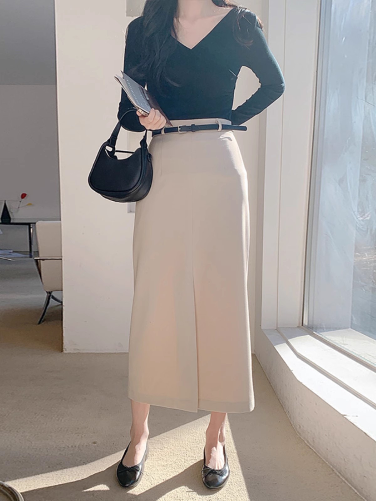 ロング丈なので上品で落ち着いた印象を与え、オフィスシーンからフォーマルな場面まで幅広く活躍します。