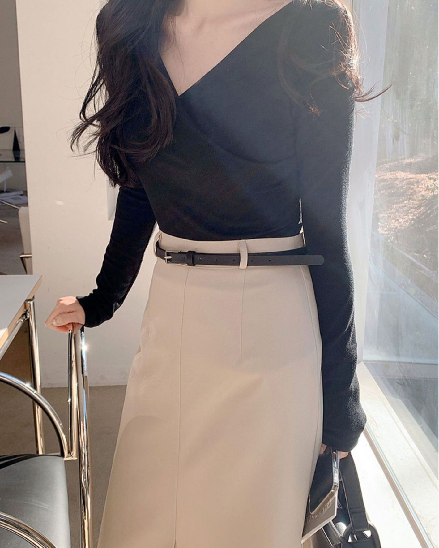細身ベルトでウエストマークすることで女性らしいシルエットが完成