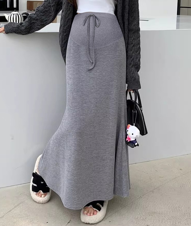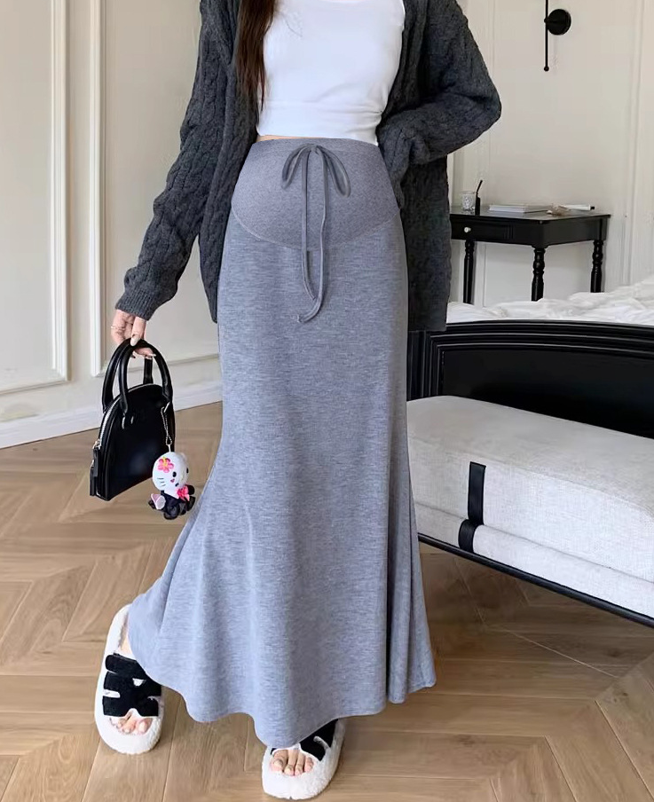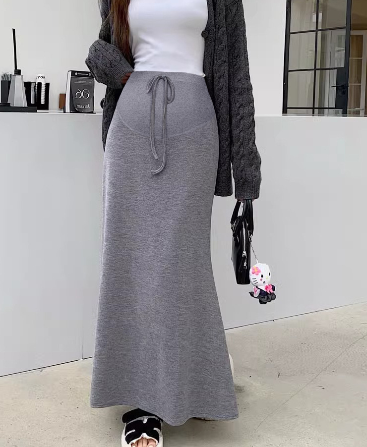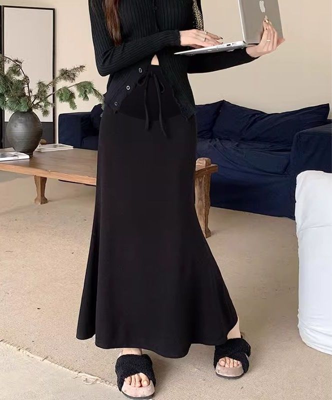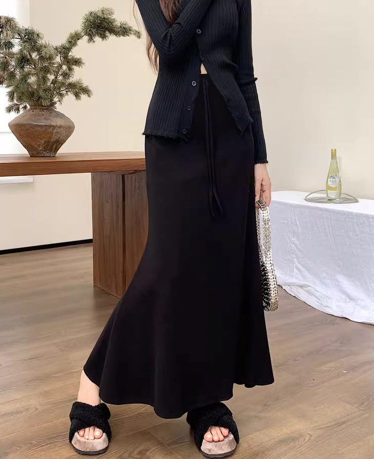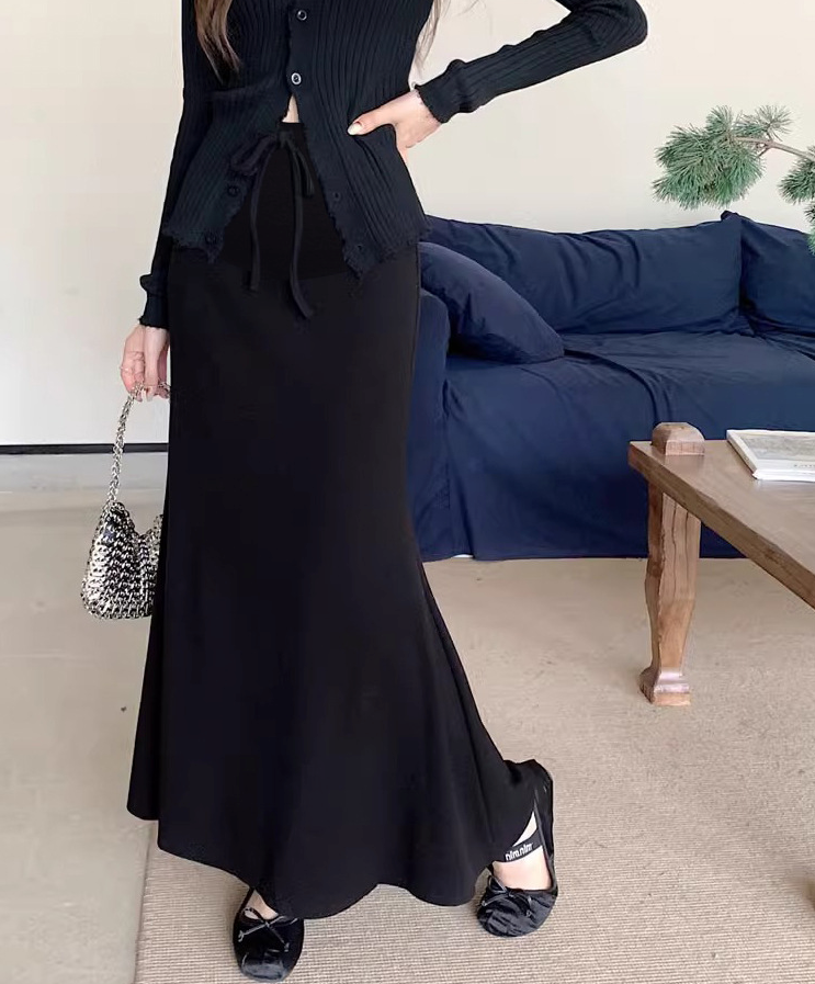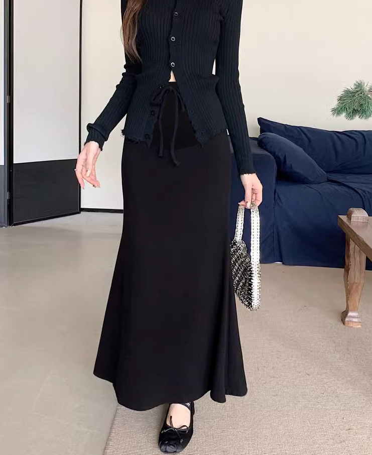 ウエスト部分のリボン紐がアクセントになったマキシ丈のタイトスカートです。