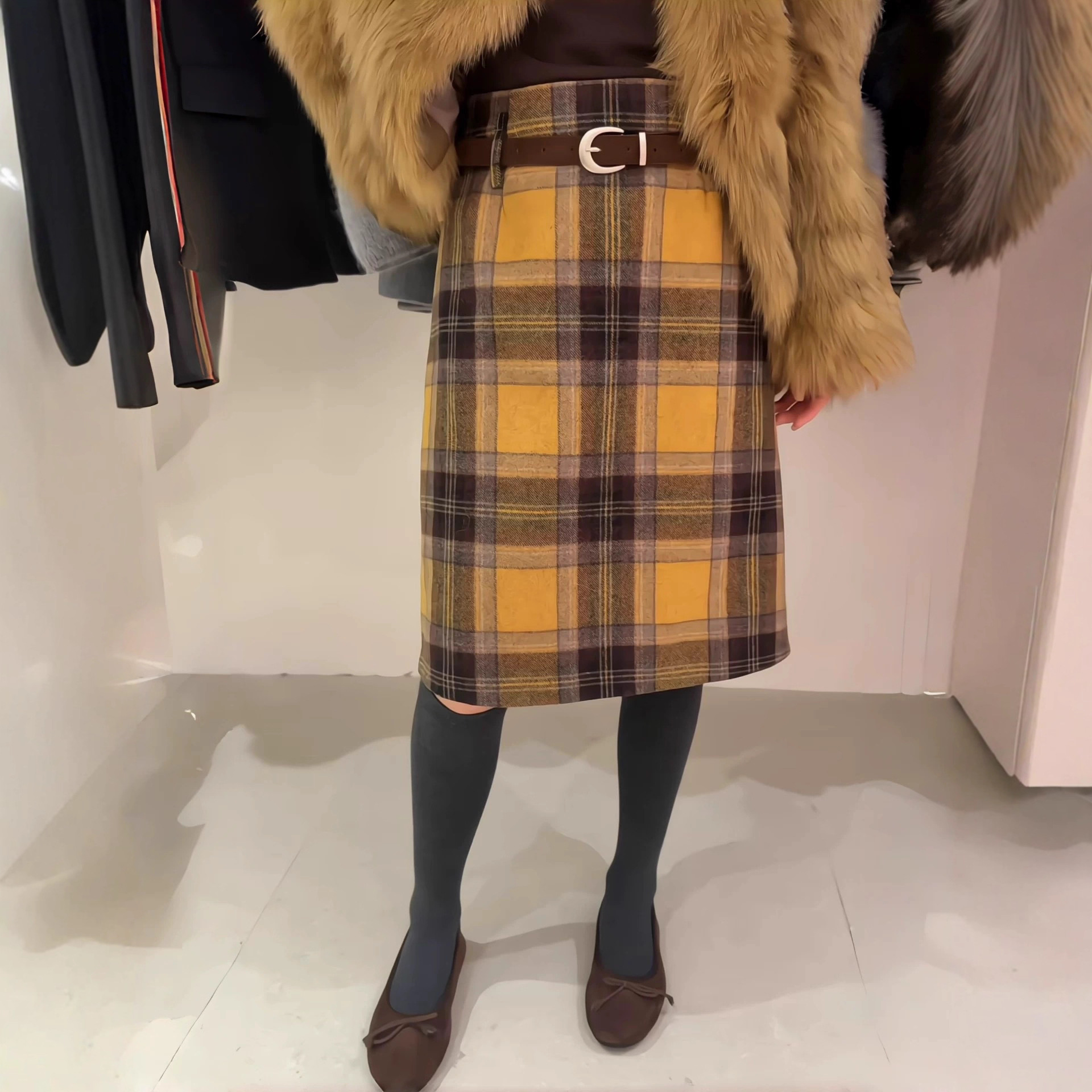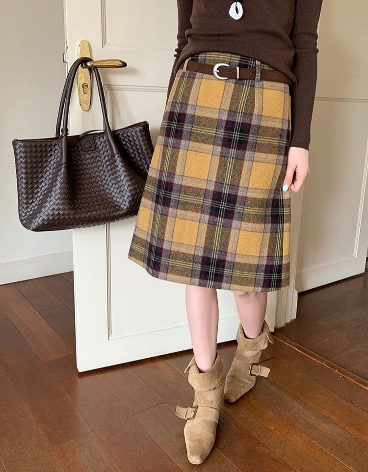 クラシックなタータンチェックが上品で知的な印象を演出し、秋冬のコーディネートにぴったりの温かな雰囲気